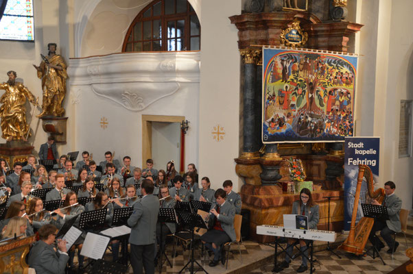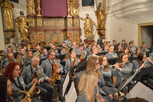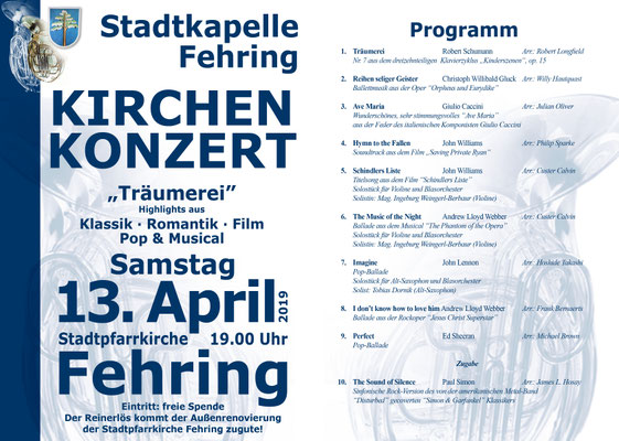 Am Samstag dem 13. April 2019 haben wir in der Stadtpfarrkirche Fehring ein Benefizkonzert zugunsten der Außenrenovierung unserer Stadtpfarrkirche gestaltet. Unter dem Motto "Träumerei" haben wir Highlights aus Klassik - Romatik - Film - Pop und Musical zum Besten gegeben. Franz Gingl hat in bewährter Weise durchs Programm geführt. Eine besondere Ehre war es, dass Frau Mag. Ingeburg Weingerl-Bergbaur uns auf der Violine unterstützt hat und somit die Stücke "Schindlers Liste" und "The Music of the Night" mit ihren Soli zu etwas außergewöhnlichem gemacht hat. Auch der Solist Tobias Dornik auf dem Alt-Saxophon hat mit seinem Solo die Pop-Ballade "Imagine" von John Lennon zu einem Hörgenuss der Extraklasse gemacht.
